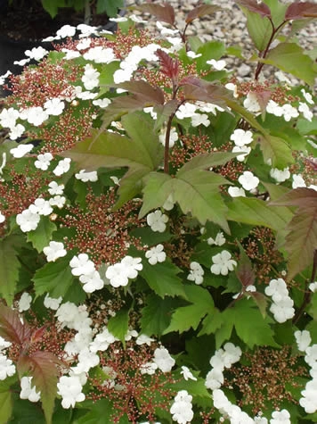 Сильноветвистый кустарник высотой до 2,5-3 м с красноватыми побегами и ярко-зелеными клиновидными крупными листьями, слегка опушенными снизу. Осенью листья оранжево-красные. Цветет в июне крупными щитковидными соцветиями. По краям соцветий расположены крупные розовато-белые стерильные цветки, в центре – плодущие цветки с красно-бордовой окраской. Плоды сочные, оранжево-красные с легкими штрихами созревают в сентябре. Возможность выращивать как на солнце, так и в тени, культура малотребовательна к почве. Лучше размещать молодые саженцы на хорошо удобренных землях, на пониженных местах с сильным увлажнением. Хорошая морозостойкость (растения выдерживают понижения температуры от -34 и до -40 градусов..