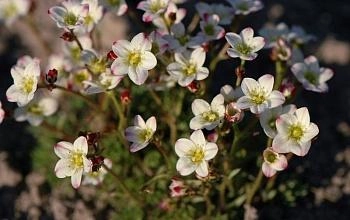 Сорт имеет зеленые листочки, объединённые в прикорневую розетку. Высота растения не превышает 15 см. Пятилепестные цветочки имеют правильную форму и белую окраску с красными вкраплениями