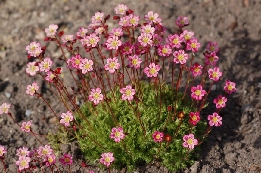 Высота 10-20 см, образует густые заросли из мелких розеток. Цветоножки тонкие, на них расположены несколько колокольчатых, восходящих цветков розовой окраски. Цветут в мае-июне. Растение вечнозеленое, очень декоративно. Она красиво смотрится в качестве почвопокровного растения, заполняет пустые места и подавляет рост сорняков. Также камнеломка подойдет для альпинариев, бордюров и контейнерных посадок.Ей нужна хорошо дренированная почва, постоянная влажность земли, полутень.