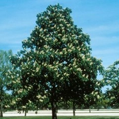 Дерево с конической, густой кроной и ветвями, отрастающими под углом 45 градусов, ширина кроны 4-6 м. Листья пятипальчатые, темно-зеленые. Цветы белые, собраны в пышные соцветия, медоносные.