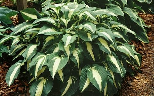 Высота куста 75см, ширина 75см, листья удлиненные сердцевидные белые с широкими темно-зелеными краями, цветки светло-лавандовые. Среднекрупная. Цветение июль-август сиренево - розовыми цветками. Предпочитают слегка кислые, влажные почвы. Теневынослива. Зимостойкий сорт.