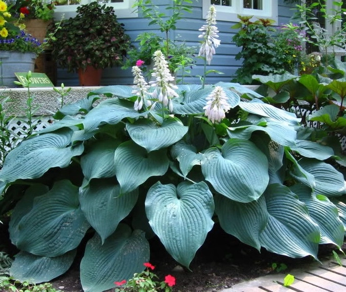 Высота до 60 см, диаметр куста до 90 см. Лист плотный, размером 28х23 см, темно-голубой. Цветки воронковидные, очень элегантные, собраны в соцветие, белые. Один из лучших крупных голубых сортов. Устойчив к повреждению слизнями и улитками.
