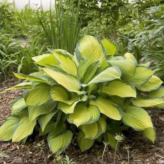 Весной листья светло-зеленого цвета с темно-зеленой каймой по краю. Затем центр листа становится золотистым, и хоста приобретает более яркую окраску.