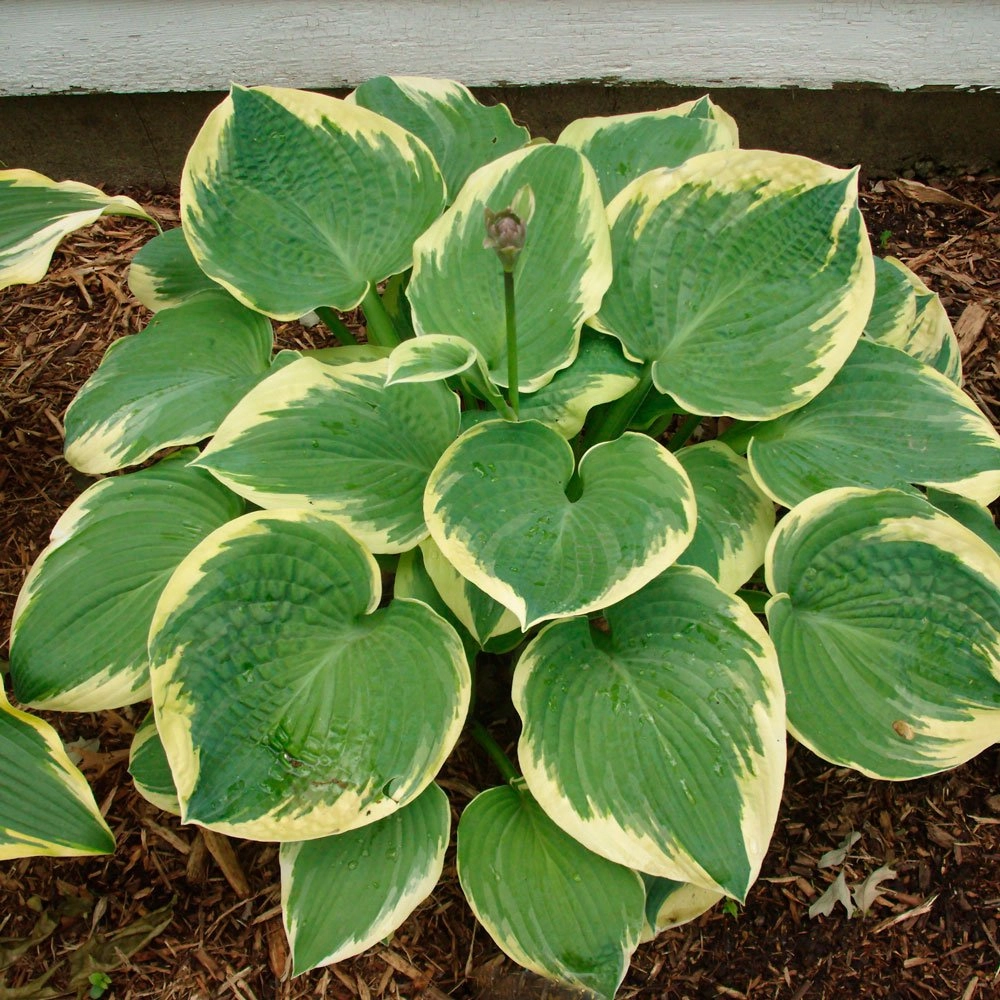 Форма куста-многолетника вырастает до 50-60 см, в ширину достигает 90 см. Округло-сердцевидные листья крупные (25 на 22 см), плотные, поверхность немного морщинистая, темного сине-зеленого цвета, по краю проходит неровная желто-кремовая полоса, к концу сезона она белеет.