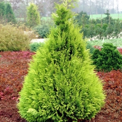 Высокорослое растение. Высота, 8 м, диаметр, 3,5 м. Годовой прирост, 20-25 см в высоту и 6-8 см в ширину. Крона: широкая снизу, резко усеченная вверху узкопирамидальная или колонновидная, остроконечная. Хвоя, чешуйчатая, расположена веерообразно в одной плоскости, светло-зеленая или салатовая с золотистым оттенком. Открытый грунт. Зона морозостойкости (USDA) 6 (от -23° до -18°).