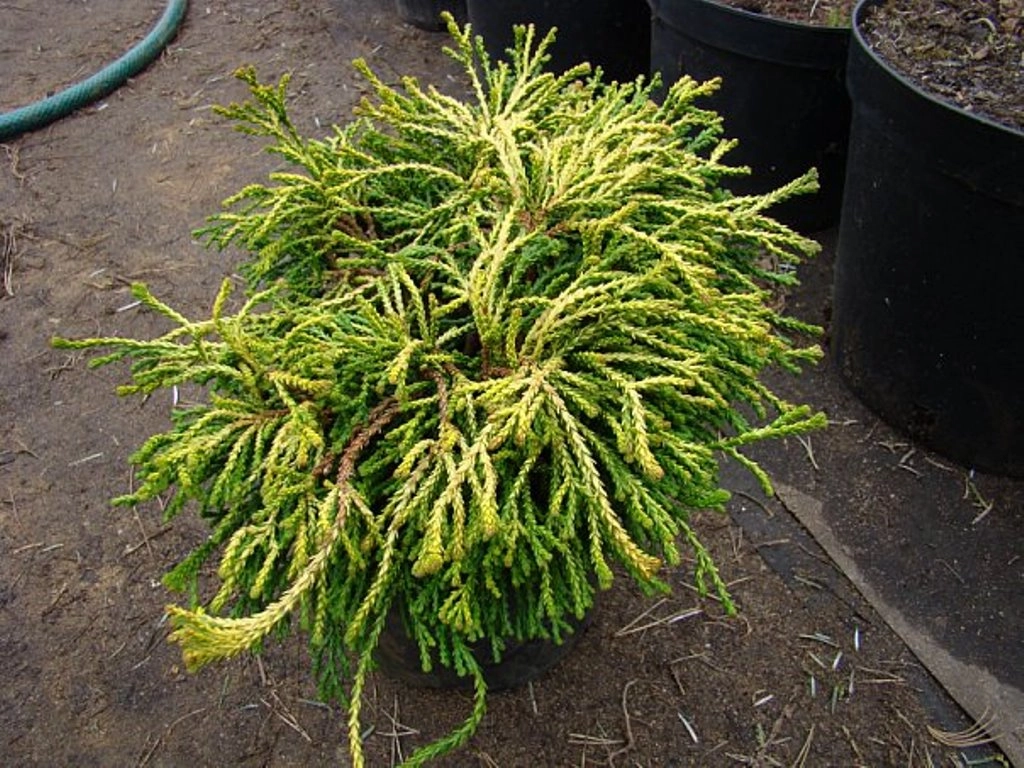 В первый период жизни крона растения распускается в красивую сферу, затем принимает неправильную подушковидную форму. Во всех обликах куст обладает высокой декоративной привлекательностью. Растет медленно: в 10-летнем возрасте это компактное украшение сада размером 0,6 м в высоту и 0,7 м в ширину. Максимальная высота взрослого куста – 1,2 м. Густая пышная крона состоит из нитевидных извилистых побегов, оранжево-красных в молодости. В раскраске кроны участвуют также золотистый, желтый и зеленый цвета. Хвоя мягкая, чешуевидная, не подпаливается на солнце и насыщает воздух приятным стойким ароматом.