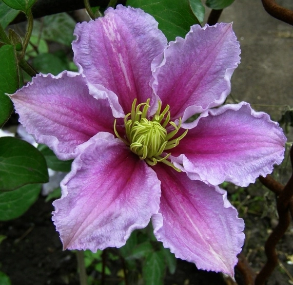 Цветение: май-сентябрь. Цветки диаметром 10 см светло-лилово-розового цвета. По середине проходит темно-розовая полоса, яркие желтые тычинки.