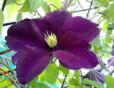 Цветение: июнь-сентябрь. Цветки тёмные, пурпурно-фиолетовые с золотистыми тычинками, диаметром от 16 до 18 см. Лепестки клематисов бархатистые и очень приятные на ощупь.