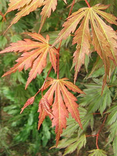 Летом и весной он радует яркой зеленой окраской листвы, а осенью становится ослепительно оранжево-красный. Листья у сорта резные, фигурные с зубчатыми краями, широколопастные.