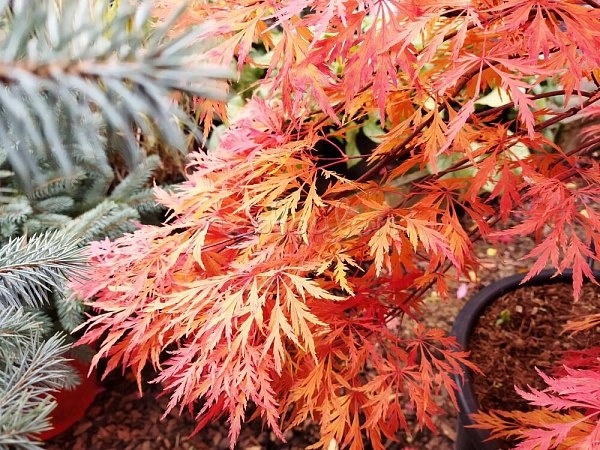 Глубоко резные, фигурные, напоминающие листья японского клена. Весной красные, летом зеленые, осенью оранжевые и багровые.