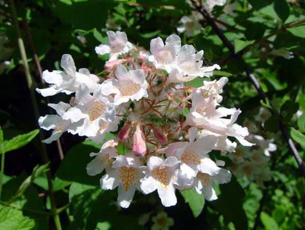 | Цветение | Цветение приходится как раз на тот период, когда почти все первоцветы уже не цветут, а летники только набирают силу. В это время кусты кольквиции, сплошь покрытые великолепными нежно-розовыми ароматными колокольчиками похожими на цветы вейгелы. Колокольчатые цветки, до 1,5 см в диаметре, собранные в небольшие щитковые соцветия, нежно-розовые снаружи и желтоватые изнутри, чуть опушенные, с волнисто отогнутыми пятью лепестками. Они издают приятный, с легким смолистым оттенком, аромат. Цветение обильное, ветви поникают под тяжестью цветов. |