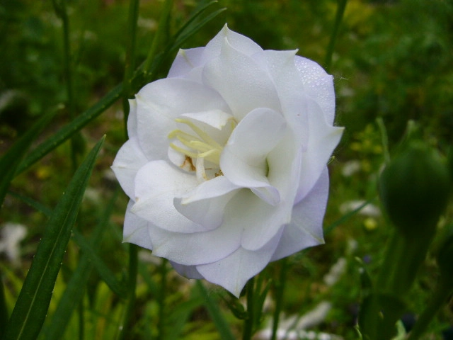 Очень эффектный сорт персиколистного колокольчика. Высота: 20-40 см. Листья собраны в прикорневую розетку. Крупные махровые цветки белого цвета расположены на длинном цветоносе. Время цветения: июль-август. Предпочитает солнечное местоположение.