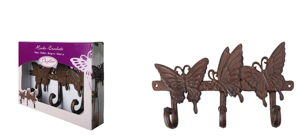 Крючок сделан из чугуна, поэтому он может выдержать достаточно большую нагрузку и не требует особого ухода. Он прослужит своему владельцу долгие годы. Этот садовый крючок состоит из трех делений, которые украшают кованые фигурки бабочек. Такой дизайн создает ощущение легкости и изящества, превращая чугунную вещь в стильный и функциональный аксессуар для дачи или загородного дома.