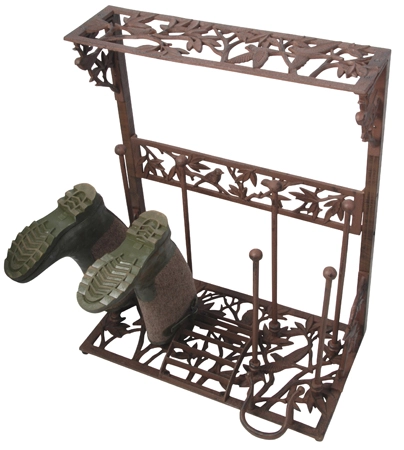 Изящная стойка для обуви сама по себе может украсить интерьер загородного дома и коттеджа. Она сделана из чугуна, благодаря чему имеет высокую прочность и может прослужить ни одно десятилетие. Однако этот необходимый аксессуар вовсе не выглядит тяжеловесным благодаря изящной ковке. Такое соединение прочности и легкости создает гармоничный эффект элегантности. К тому же весь образ этого изделия говорит о том, что его обладатели – люди с изысканным вкусом.