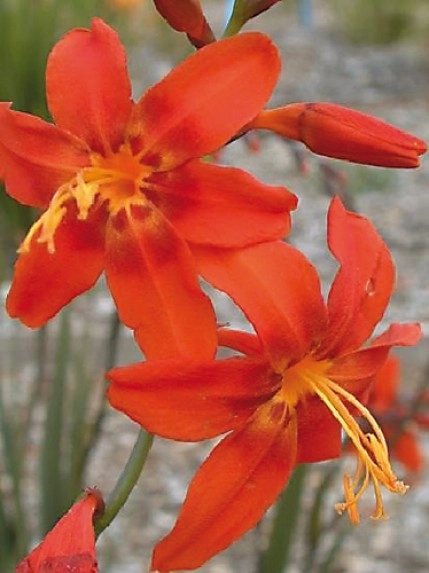 Высота до 100 см. Стебель прямой, разветвленный. Листья узкомечевидные, до 2,5 см шириной, прямостоячие, в густых пучках. Цветки некрупные, 3-5 см в диаметре, воронкообразные, оранжево-красные, собраны в верхушечное, небольшое метельчатое соцветие. Цветет в июле-августе, одновременно до 10 цветков.