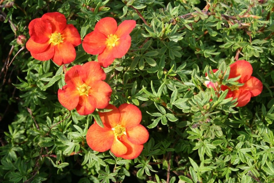 Карликовый долгоцветущий кустарник высотой до 0,5 м. с плотной кроной и нежными стелющимися побегами с яркими оранжево-красными цветами. Листья перистые пятипальчатые, мелкие, светло-зеленые. Оранжево-красные яркие цветы особенно эффектны ранней осенью. Не утрачивают своих декоративных качеств и в жаркое время. Цветение продолжительное, продолжается с июня по октябрь. Морозостойкость, неприхотливость, стрессоустойчивость. Оптимальнее всего располагать кустарник на солнце, но так, чтобы в жаркий полдень он оказался слегка затененным. В целом же кусты неплохо себя чувствуют и в полутени. Однако сильных ветров они боятся. К грунту особых предпочтений нет, но оптимальными окажутся дренированные легкие земли с достаточным уровнем влажности.