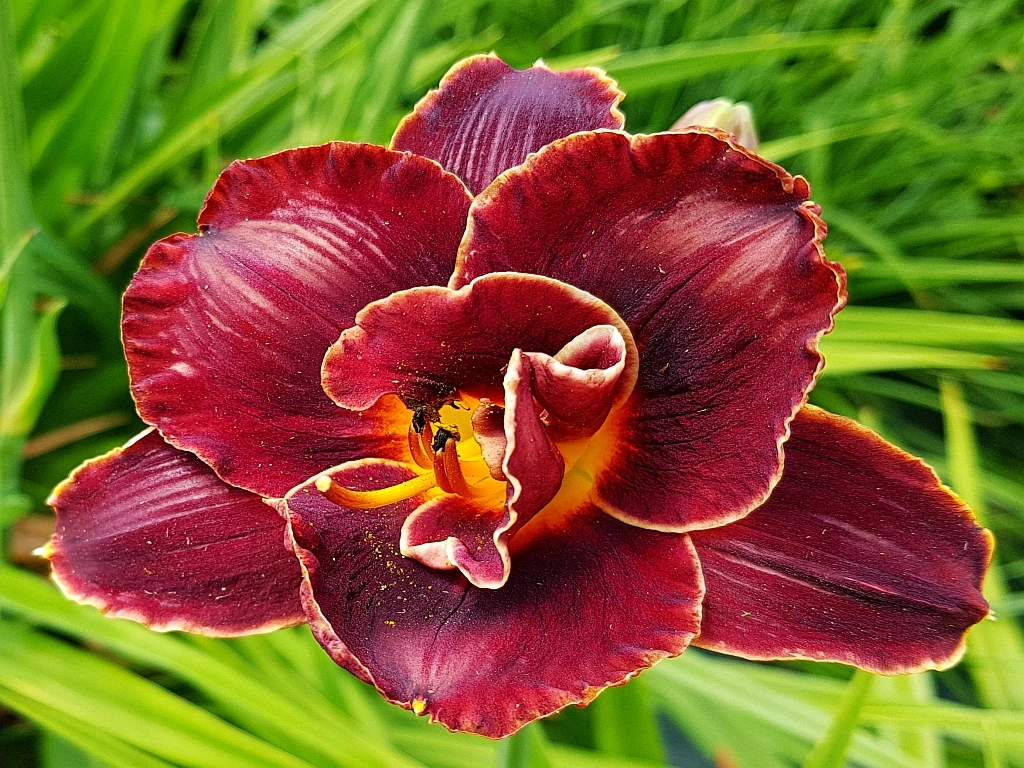Покровный цвет лепестков темно-красный, на внутренних лепестках лепестки с белой окантовкой,цветок диаметром 10-13 см.