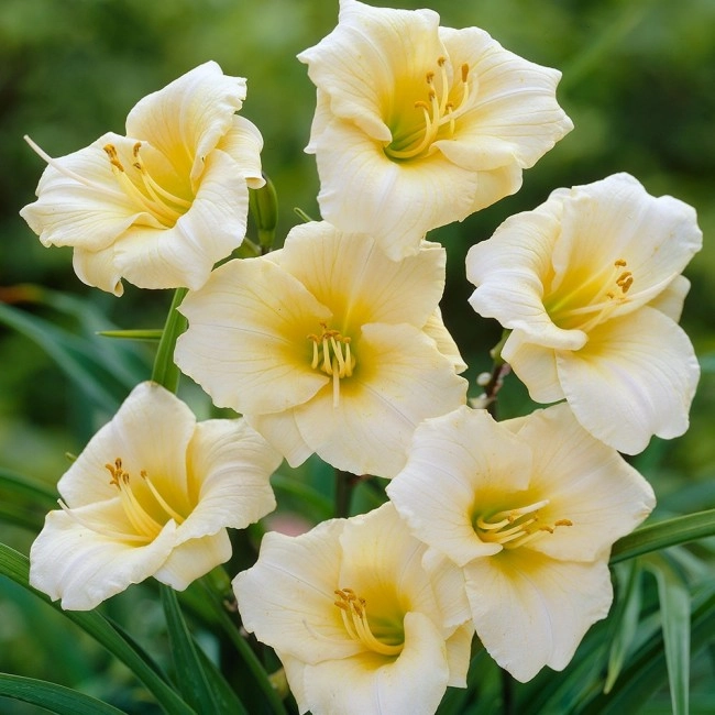 Цветки сливочно-белые с зеленовато желтым глазком и глубокими прожилками над зеленым горлом. Цветки диаметром 10 см. Зацветает в июле и цветет на протяжении 35-40 дней. Цветки обладают легким ароматом. Крепкие цветоносы возвышаются над кустом. На каждом цветоносе одновременно цветут 1-3 цветка. В конце лета – начале осени, возможно, повторное цветение, но цветков образуется гораздо меньше. Кустарник низкорослый – полувечнозеленый прочный, высотой 50 см. Листья прикорневые, яркие, сочные, узкие. На зиму листья отмирают. Лилейники можно отнести в группу, самых неприхотливых многолетников. Взрослый куст лилейника образует 20 – 30 цветоносов, на которых поочередно распускаются по 15 – 20 цветков. В средней полосе России для посадки следует выбирать открытое солнечное место. Массово и качественно куст цветёт только при полном солнечном освещении. Допускает посадку в полутени. Подходит глинистая, с добавлением перегноя. 3 зона (-34,5//-39,9'C)