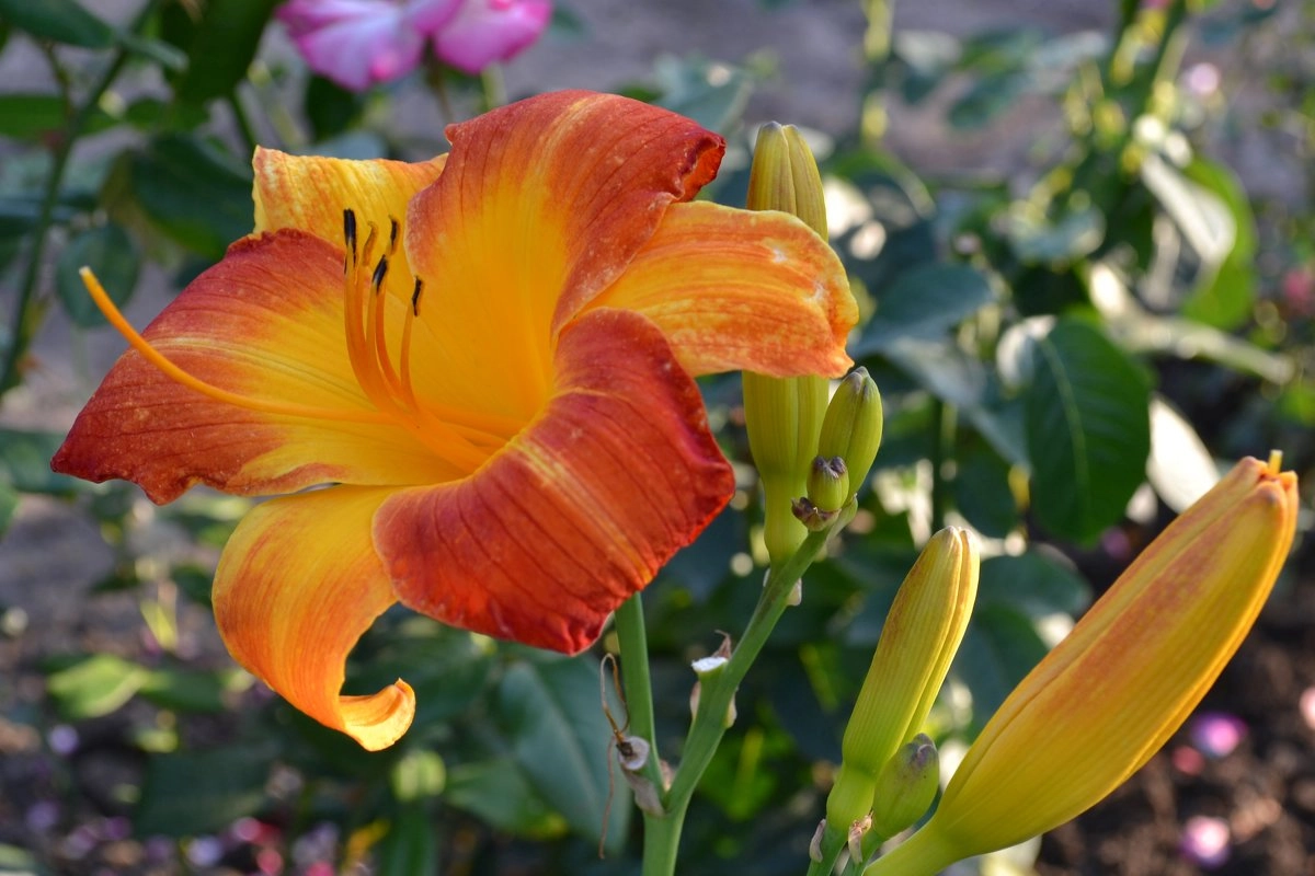 Сорт полностью оправдывает свое название - "Утреннее солнце". Высота 75-80 см. Листья узкие, ярко-зеленые, изогнутые, сохраняющие декоративность весь сезон. Цветы расположены на концах длинных цветоносов. Цветок средних размеров, окраска лепестков двухцветная. Половина лепестков имеют ярко-желтую окраску, а вторая половина бордово-красную. В результате получается очень веселая и жизнерадостная расцетка. Сорт долгоцветущий. Время цветения: июль-август. Предпочитают открытые, хорошо освещенные участки. Могут выносить небольшое затенение, но цветение при этом менее обильное. Подходит глинистая, с добавлением перегноя. 3 зона (-34,5/-39,9'C).
