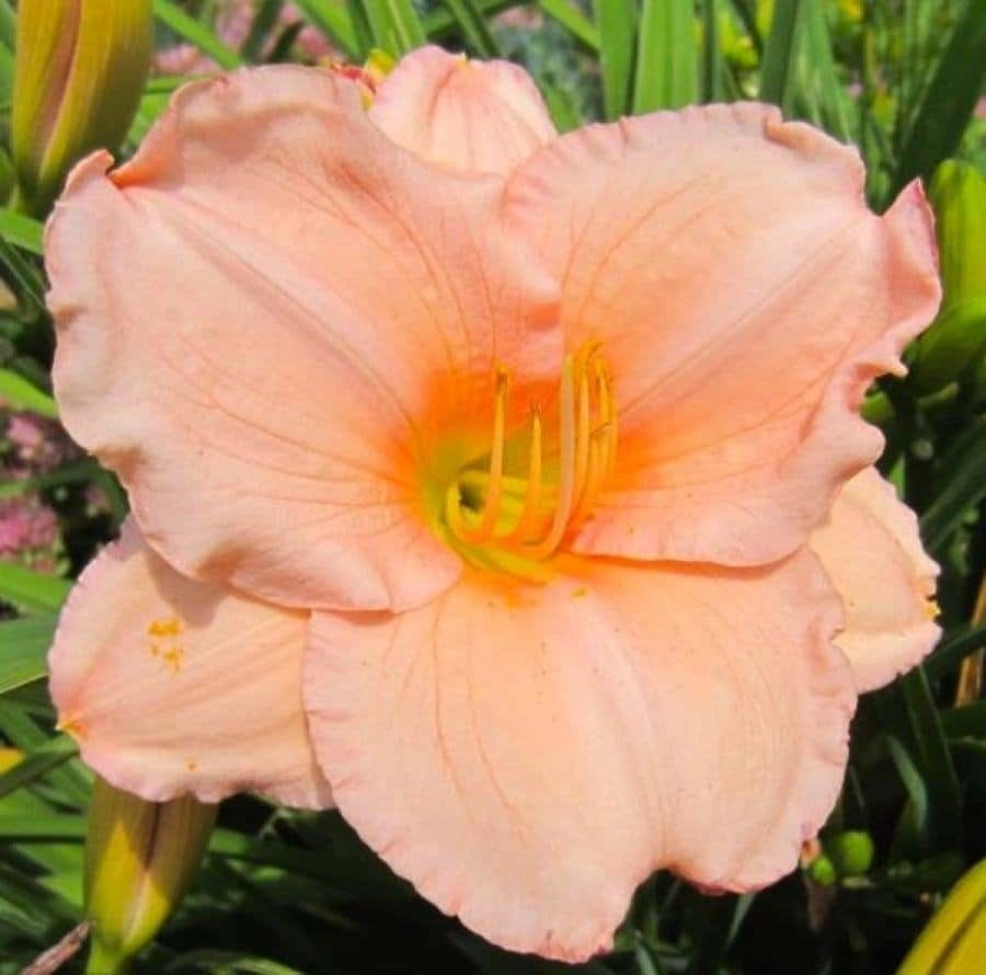 Цветок: розово - персиковый. Жетый глазк. Высота: 45 см Ширина: 40 см Период цветения: июль-сентябрь Повторноцветущий Невысокий, бордюрный, для посадок на переднем крае сорт персико-розового цвета. Горлышко маленькое, золотистое. Глаз узкий темно-розовый. Лепестки однотонные, гофрированные. Цветет обильно, с июля.
