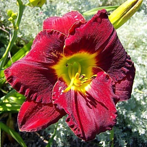 | Цветок | Бархатистые, темно-пурпурные цветки с зеленовато-жёлтым горлышком и тоненькой желтой окантовкой на гофрированных лепестках. Диаметр цветка 13 см |