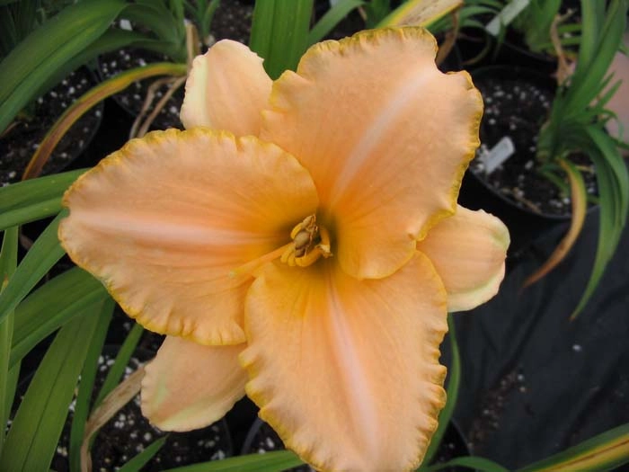 Цветки: Цветки 11 см, бледно-розово-персиковые с зелёноватым горлом и жёлтой гофрированной каймой. Период цветения: июнь-июль. Морозостоек.
