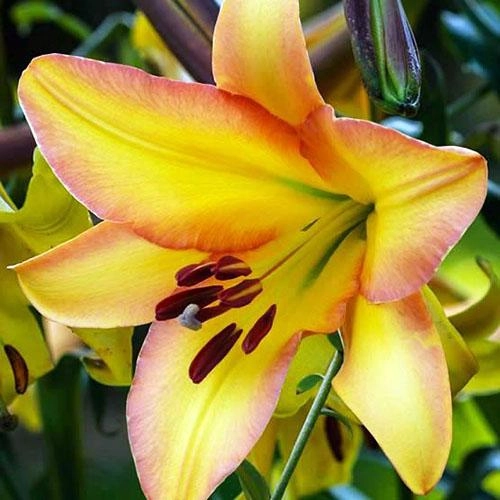 Лилия относится к виду ОТ-гибрид. Высота лилий доходит до 130 сантиметров. Стебель – прямой. Характер роста – среднерослый. Листья ярко-зеленые, ланцетные. На каждом цветоносе вырастает до 7 бутонов.Форма цветка– воронковидная. Цветы направлены по сторонам или вниз. Окрас – желтый с выразительной розовой каймой. Основной окрас – желтый. Участок должен быть или немного затененным, или солнечным. Отдельного внимания заслуживает почва. Лилии предпочитают рыхлый грунт, насыщенный большим количеством питательных элементов. Идеально подойдет известкованная, а также глинистая или песчаная земля. Лилия Райзинг Мун обладает высокой устойчивостью к заморозкам, поэтому цветы необязательно укрывать на зиму. Зона морозостойкости – 4.