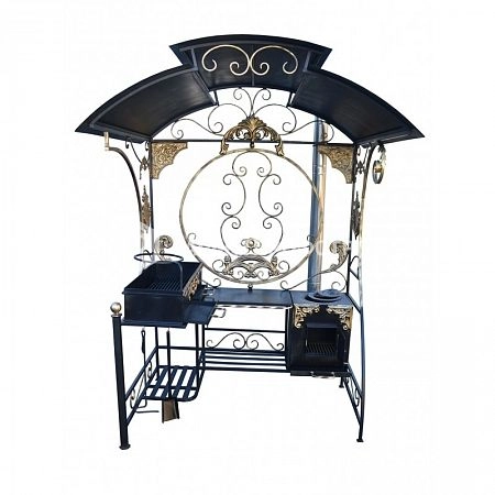 Представляем универсальный кованый мангал с крышей "Император", изготовленный методом ручной ковки. Чеканные декорации и великолепный орнамент в сочетании представляют великолепную картину мангала. Цельносваренный каркас изготовлен из стальных труб, которые выдерживают значительные нагрузки. К каркасу приварена стальная скатная крыша с козырьком и прорезями для отвода дыма. Кованный мангал с крышей «Император» - изделие многофункциональное.