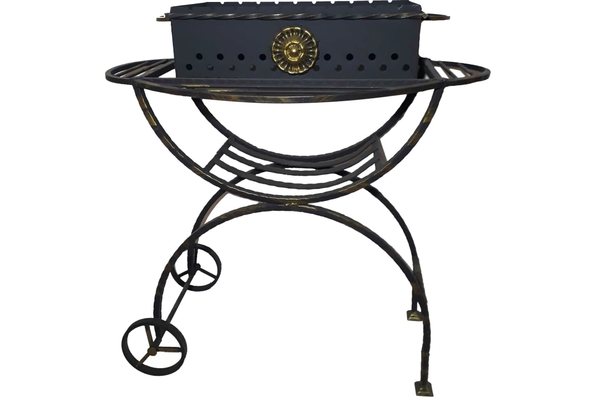 Конструкция изделия выполнена из прочного металла окрашенного, жаростойкой краской.Отверстия на корпусе обеспечивают равномерное горение угля.Полочка служит для хранения необходимых при готовке принадлежностей.Для простого перемещения мангала по территории предусмотренны колеса.