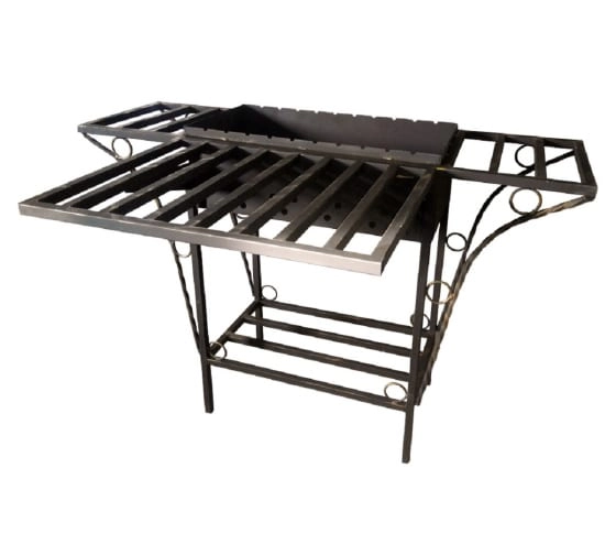 Оформлен элементами холодной ковки, а также рисунком из стального прута.Корпус выполнен из профильной трубы сечением 15х15, жаровня толщиной 2мм.Вся конструкция покрыта термостойкой краской, которая выдерживает очень высокую температуру. Это гарантирует долгий срок службы.На мангале есть откидной стол и по бокам два встроенных мини-столика.
