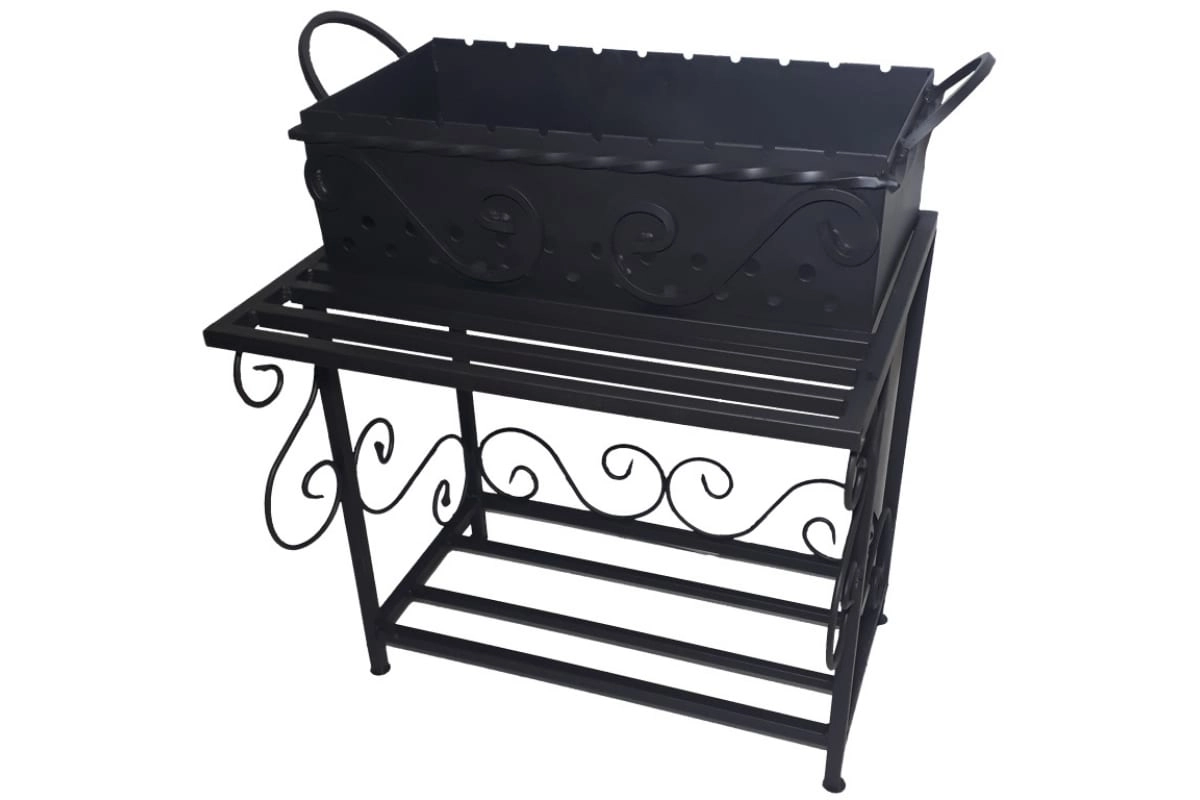 Имеет красивый дизайн, поэтому украсит любой участок.Для удобной переноски имеет специальные ручки.Внизу оборудована поленница для комфортного хранения растопки.