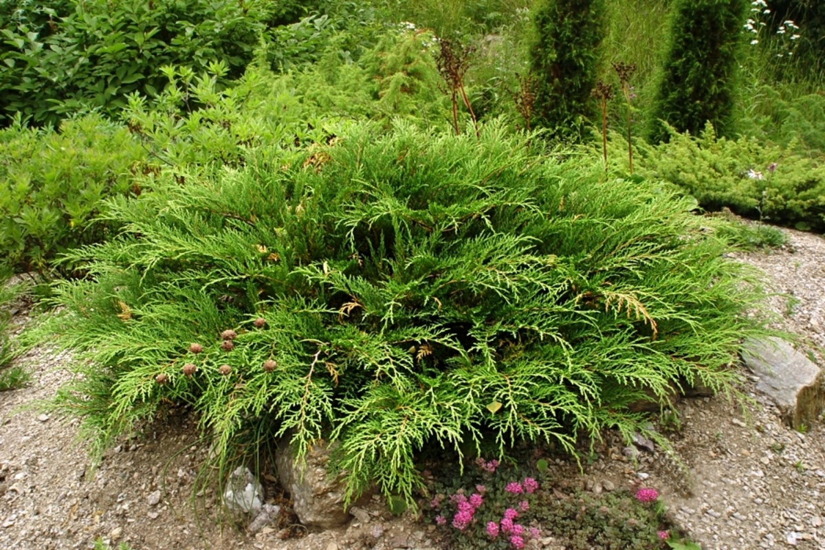 Высота 0,5-0,7 м, ширина 1,5 - 2 м. Годовой прирост- 5см. Предпочитает солнечное или слегка затененное место. Почва -состоящий из суглинка или супеси с некоторым добавлением крупного щебня. Растение не переносит излишней влаги у корней, так как в природе произрастает на скальных грунтах. Крона низкая, раскидистая. Хвоя в виде мелких иголочек и чешуек матового темно-зеленого цвета, осенью рыже-коричневая. Для одиночных посадок, каменистых садов, декорирования склонов. Морозостойкость до -40.