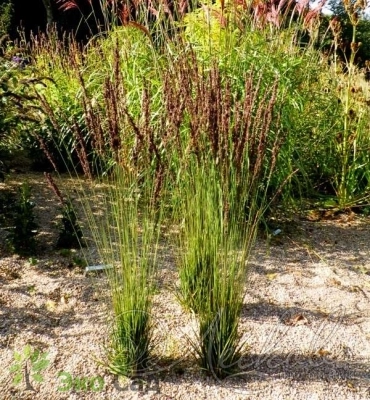 Листья зеленые, куст узкий, плотный, вертикально стоящий. Высота цветущего растения 60-90 см. Цветы и семена бурые. В июле появляются буроватые метелки цветков, превращающиеся затем в буро-черные, по мере созревания зернышек.