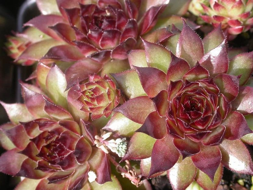 Высота 10-20 см. Мясистые листья сочные, гладкие, собраны в крупные розетки, пурпурные. Цветки розовые, звездчатые. Период цветения июнь-июль.