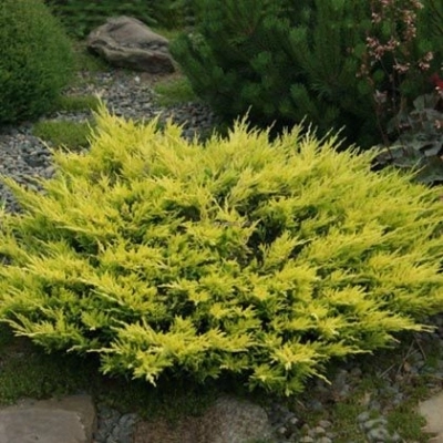 В дикой природе можжевельник обитает в горах, холмистых районах и на песчаных берегах водоемов Северной Америки. Растение растет не торопясь, прибавляя в ширине по 8 см в год и совсем немного вытягиваясь вверх. Высота окончательно сформировавшегося кустарника – 0,4 м, ширина – 1,5-2 м. Золотистые побеги кустарника растут равномерно и в наклон, как лучики солнца. Молодые приросты обрастают хвоей зеленого цвета, летом она желтеет, к зиме темнеет. До нового прироста можжевельник смотрится пушистым рыжиком с бронзовым отливом.
