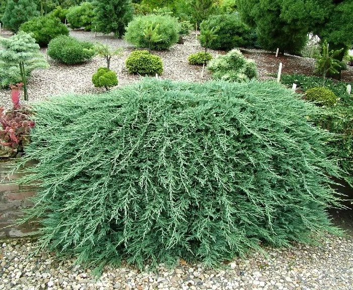 Можжевельник Вилтони обладает уникальной способностью принимать форму любой поверхности. Вмешательство садовника нужно минимальное: выборочная подвязка ветвей, и мягкий податливый хвойник приятного голубовато-зеленого цвета покрывает стену, повторяет неровности склона, лестничные уступы, окутывает террасу. Высокодекоративный сорт стал родоначальником большой группы можжевельников коврового типа.