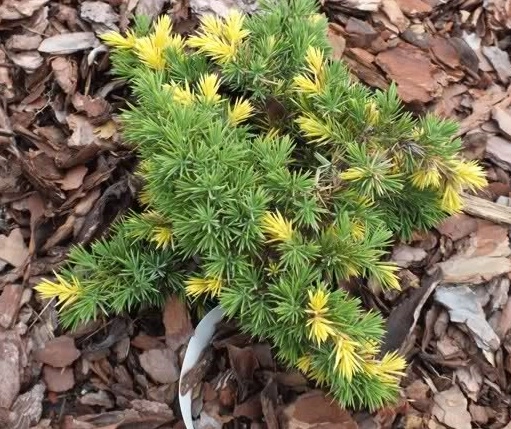 Это сорт невысокого хвойника со стелющимися побегами, у которого они немного приподняты на самых кончиках. Размеры взрослого можжевельника Голден Вингс: высота – около 30 см, а диаметр кроны – 1 м. Растение декоративное, выделяется двухцветной краской хвои.