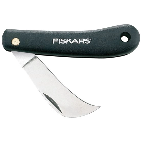 Нож садовый изогнутый для прививок FISKARS (1001623). Fiskars производит ножи для различных садовых нужд. Их прочные лезвия изготовлены из углеродистой стали, что обеспечивает ножам долгий срок службы. Нож для прививок Фискарс - самый подходящий инструмент для прививания, подрезания, подравнивания кустарников и деревьев. Изогнутое лезвие облегчает работу на срезах, особенно толстых, и позволяет предотвратить ранение растений. Нож садовый складной удобен при вырезке шипов, обрезке ветвей и корневой системы, при посадке растений. Благодаря ручке из пластика захват будет удобным и рука не соскользнет при усилии, а сама ручка останется неповрежденной. Лезвие изготовлено из высокопрочной нержавеющей стали. Отверстие в рукоятке сделает хранение этого ножа более удобным. Латунная заклепка не даст лезвию расшататься и выскочить из ручки