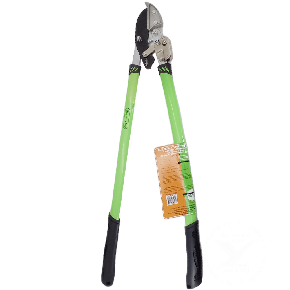 Ножницы изготовлены из высококачественной стали. Упорное зубчатое лезвие с захватом в внутрь и режущее лезвие, позволяет надежно закрепить в инструменте срезаемую часть куста. Ручки - овальные, металлические, с пластмассовыми накладками на концах.