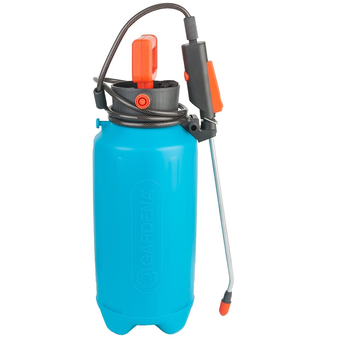 Опрыскиватель Gardena 5 л 00823-20.000.00 - пластиковый резервуар объёмом 5 литров с пневматическим насосом, вмонтированным в крышку, используемый для распыления жидкостей и полива растений. Закачка воздуха производится путем перемещения ручки вверх и вниз. Для подачи жидкости необходимо нажать на рычаг, расположенный на рукоятке. Опрыскиватель снабжен ремнем, который позволяет переносить его на плече.