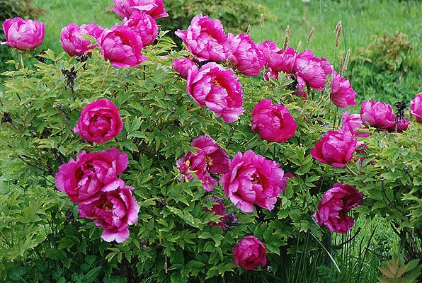 Характерные черты древовидных пионов – это толстые маловетвистые прямостоячие побеги с ажурными ярко-зелеными орнаментальными дважды перистыми листьями. Куст полушаровидной формы в высоту в Средней полосе России обычно 1-1,5 метра. рупные шаровидные бутоны превращаются в очень крупные, 12-22 см в диаметре, простые (6-12 лепестков) или махровые цветы, располагающиеся на концах однолетних побегов. На одном кусте может цвести до 100 цветков. Морозоустойчивый кустарник. устойчив к болезням и вредителям. Место для посадки, солнечный участок.