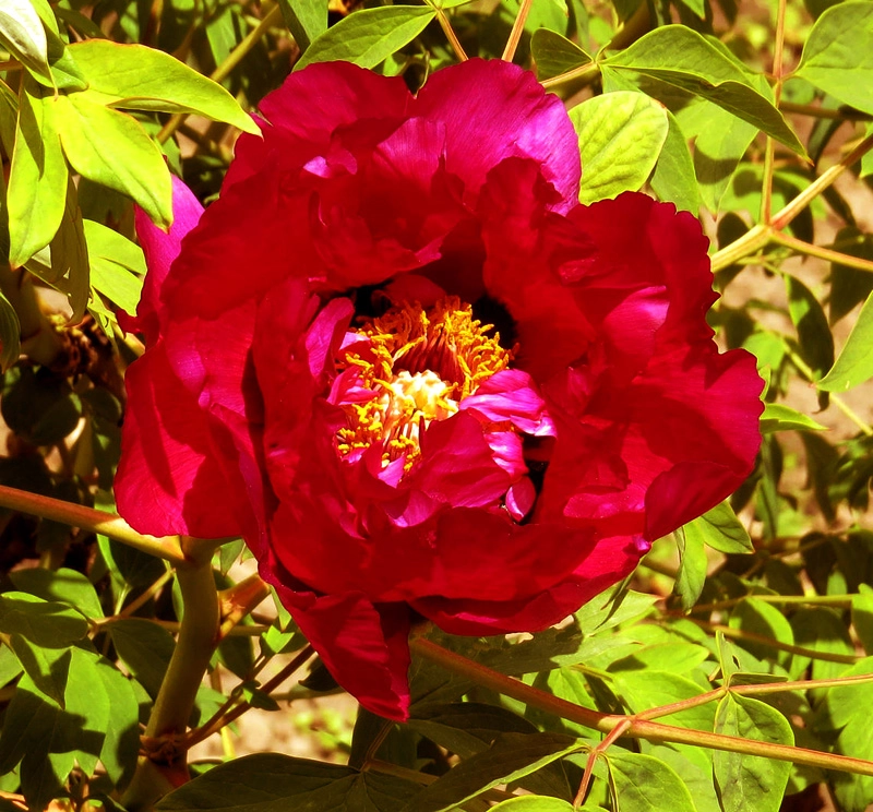 Куст мощный, побеги сильные, вертикальные.Цветки красные, корончатой формы, 15 см в диаметре.Цветение обильное, в мае. Место посадки должно находиться вдалеке от больших деревьев, в защищённом от ветра месте, с хорошим отводом дождевой воды. Совершенно не пригодны сырые, заболоченные места. Почва должна быть водопроницаема, плодородна. Пион древовидный может считаться вполне холодостойким кустарником. Он хорошо переносит зиму в европейской части России без укрытия.