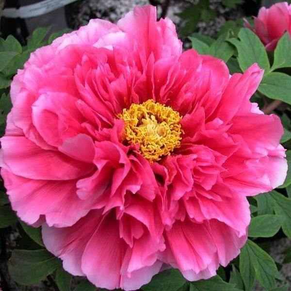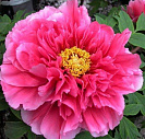 Цветки диаметром 20-25 см, полумахровые, ярко-розово-красные, блестящие. Верхняя часть лепестков в процессе цветения становится красновато-фиолетовой. Центр цветка жёлтый.