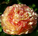 Цветы большие махровые, в форме шара, желтые, с золотистыми лепестками, красными и оранжевыми оборками. Диаметр цветка 30 см.
