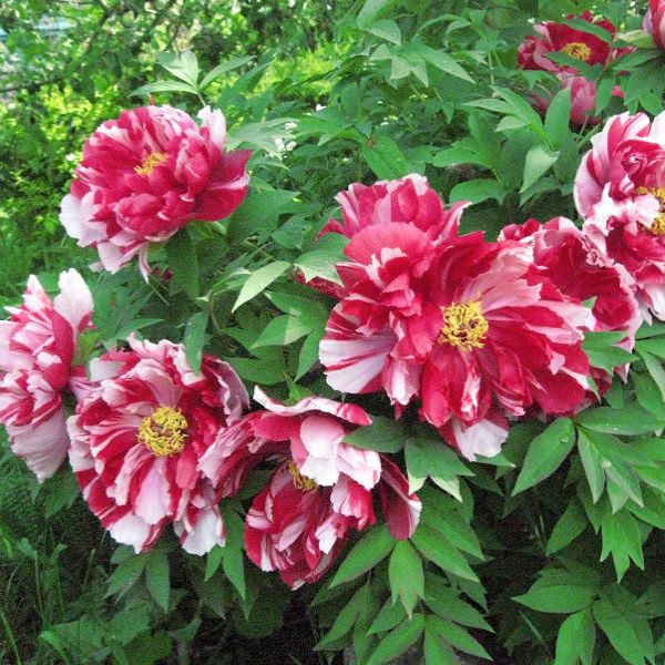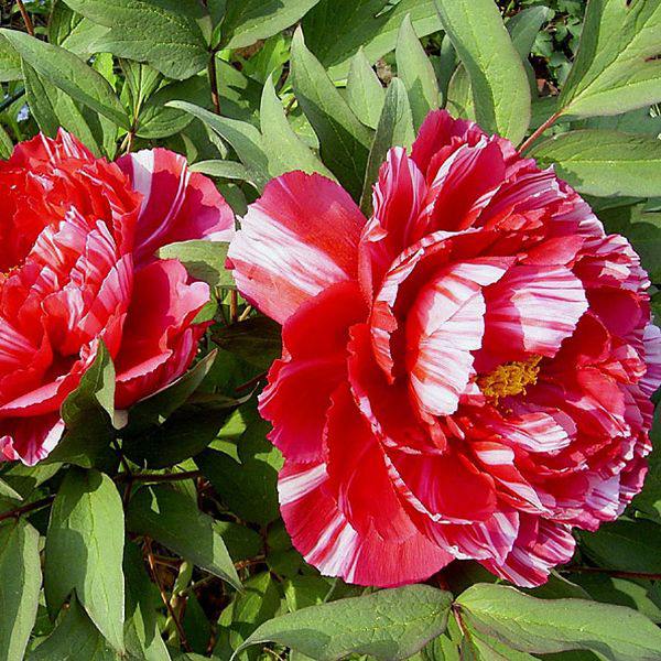 Цветки очень крупные, махровые, волнистые. Окраска пёстрая, вишнёво-красная с белыми и нежно-розовыми мазками. Каждый цветок неповторим и отличается от другого.