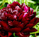 Один из самых тёмных сортов среди бордовых пионов. Махровые цветки состоят из многочисленных атласных лепестков! Их диаметр – около 20 см.
