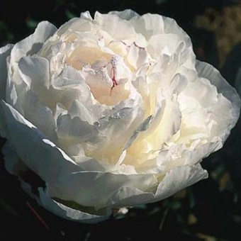 Махровый бомбовидный. Цветок диаметром 15-16 см, компактный, розовеюще-белый с чуть розовым центром и узким малиновым краем на некоторых лепестках.Высота куста 90 см