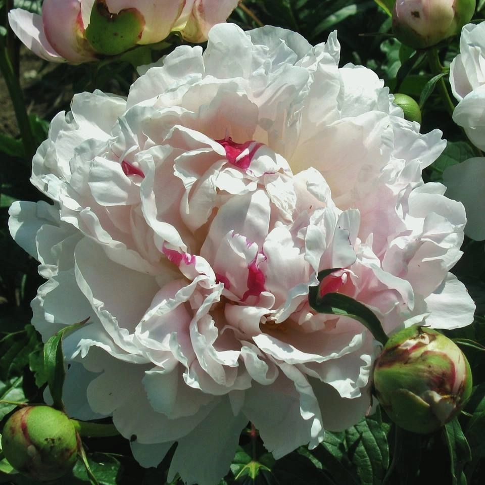 сорт с махровыми кремово-белыми цветками, украшенными легким розовым румянцем. Диаметр цветка достигает 15 см. Отличительная особенность сорта - вкрапления пурпурно-красных полос на нескольких лепестках. Листва пышная, ажурная, темно-зеленого цвета. Стебли крепкие и прямые.