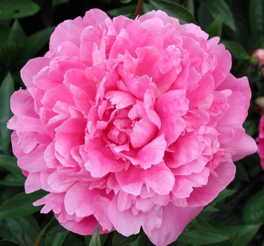 Молочноцветковый. Высота 60-70 см. Махровый розовидный. Цветок диаметром 16 см, компактный, сверкающий тёмно-розовый, сильно выделяется на фоне тёмно-зелёной листвы. Аромат слабый. Стебли прочные. Цветение очень обильное. Очень позднего срока цветения.