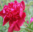 Махровый розовидный. Цветы диаметром до 17 см, ярко-красные, с тёмным центром, тёмно-красные с синим оттенком, с шелковистым блеском. Края лепестков светлее, между лепестками просвечивают золотистые тычинки.